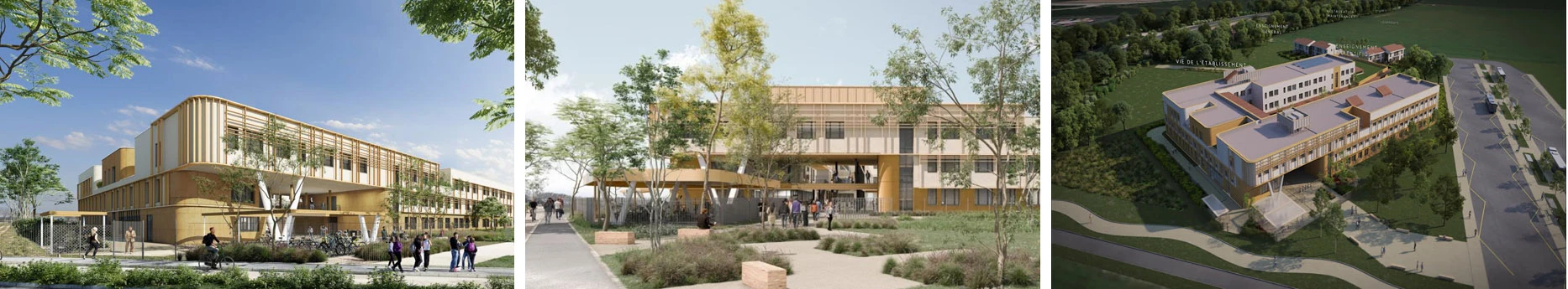 Le futur établissement scolaire de Meximieux pourra accueillir 1200 élèves à la rentrée 2027. Un lycée innovant de 8530 m² sur 3 niveaux, qui comprend notamment une cantine scolaire de 385 places, des façades en ossature bois et des panneaux photovoltaïques.